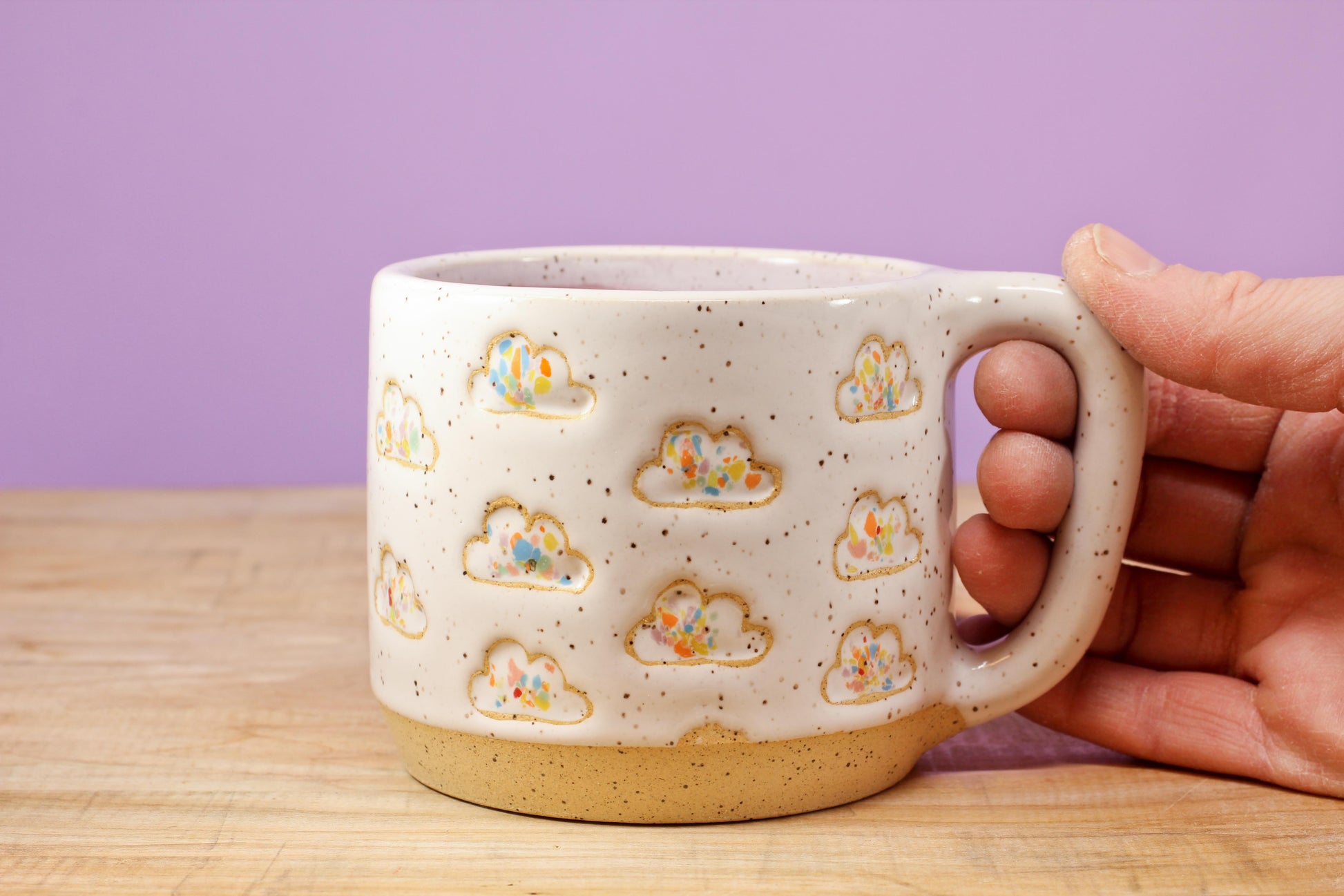 More deliciously colourful than I could have dreamt; these candy crush clouds are a real eye pleaser! This piece is wheel thrown, hand stamped and glazed. The interior is a light purple with a white glossy exterior on a light speckled stoneware clay body. Lose yourself while staring into these dreamy clouds, just try not to spill while doing so!