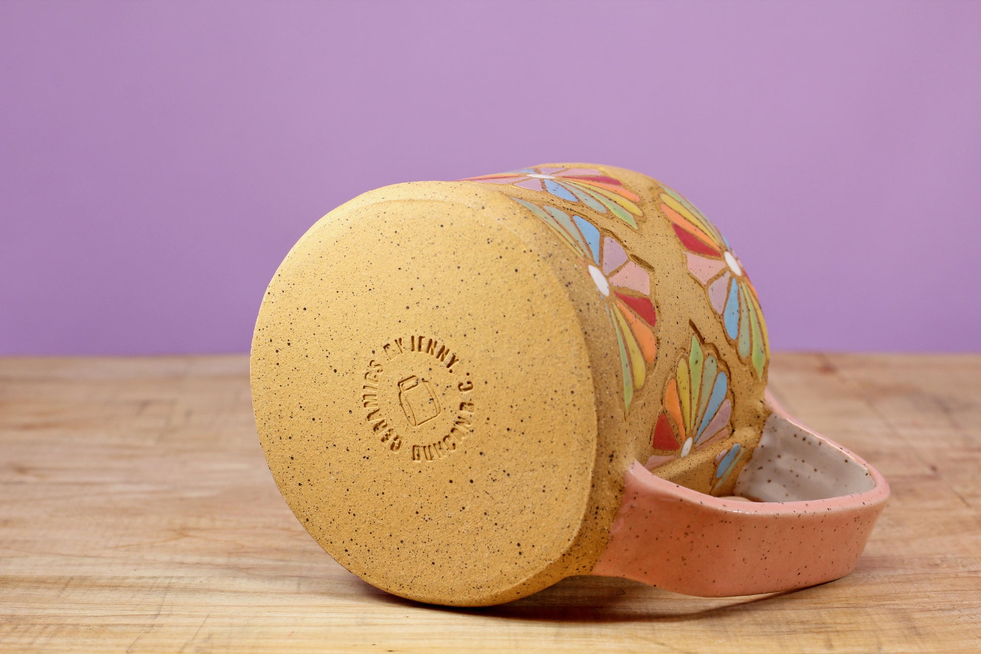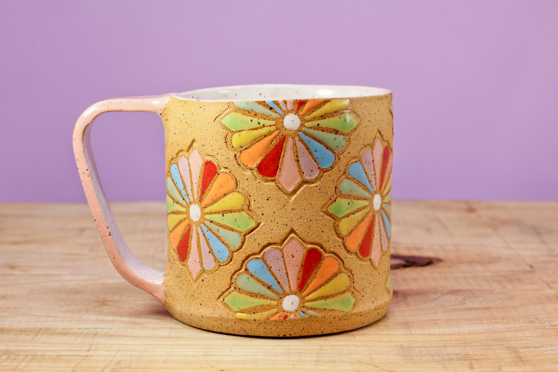 This darling of a mug is inspired by the beautiful vintage quiltwork of the 1930’s. It is hand built with speckled stoneware and has a slightly more organic shape than the wheel thrown pieces. The exterior designs are imprinted in the raw claybody and hand painted with a glossy glaze. If your looking to add a little more vintage quilt goodness to your day without buying more quilts, this could be the mug for you!