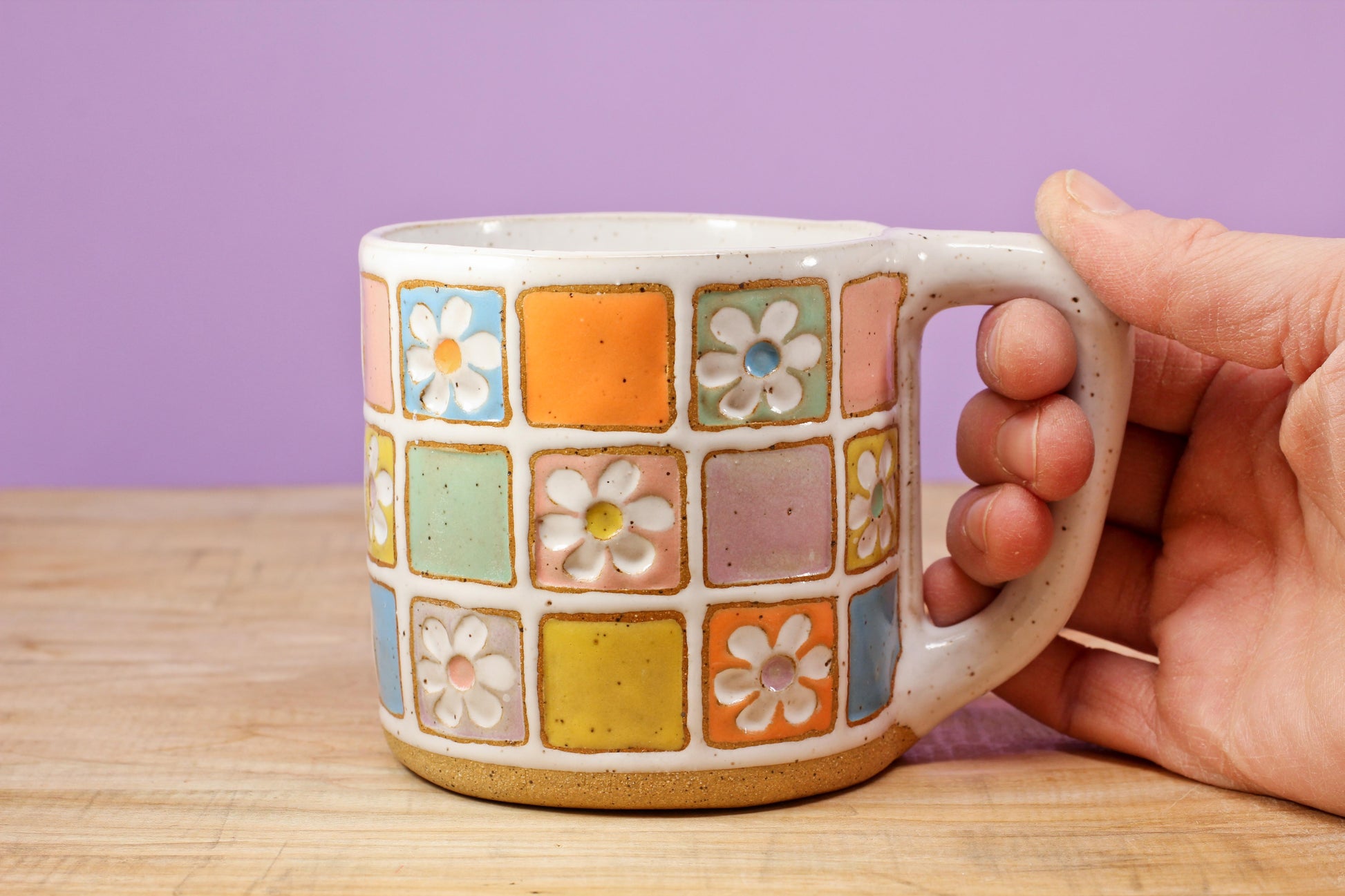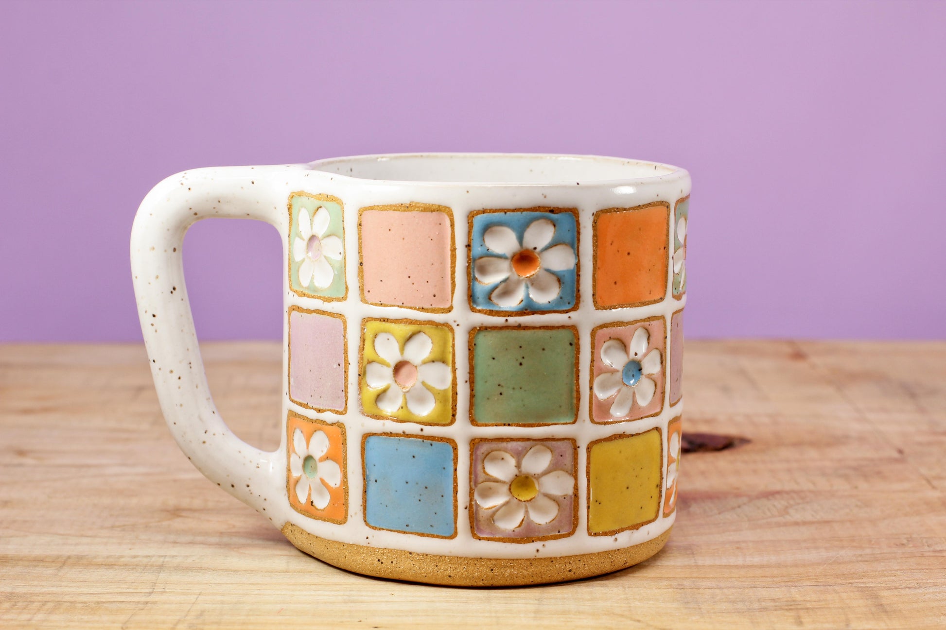 This hand built piece of magic was inspired by sweet picnic blankets and tile jobs that dreams are made of! Hand stamped, painted and slab built, this speckled stoneware mug has a slightly more organic shape than the wheel thrown pieces. Interior and handle are a glossy white with a mix of colourful glazes for the block and flower details.