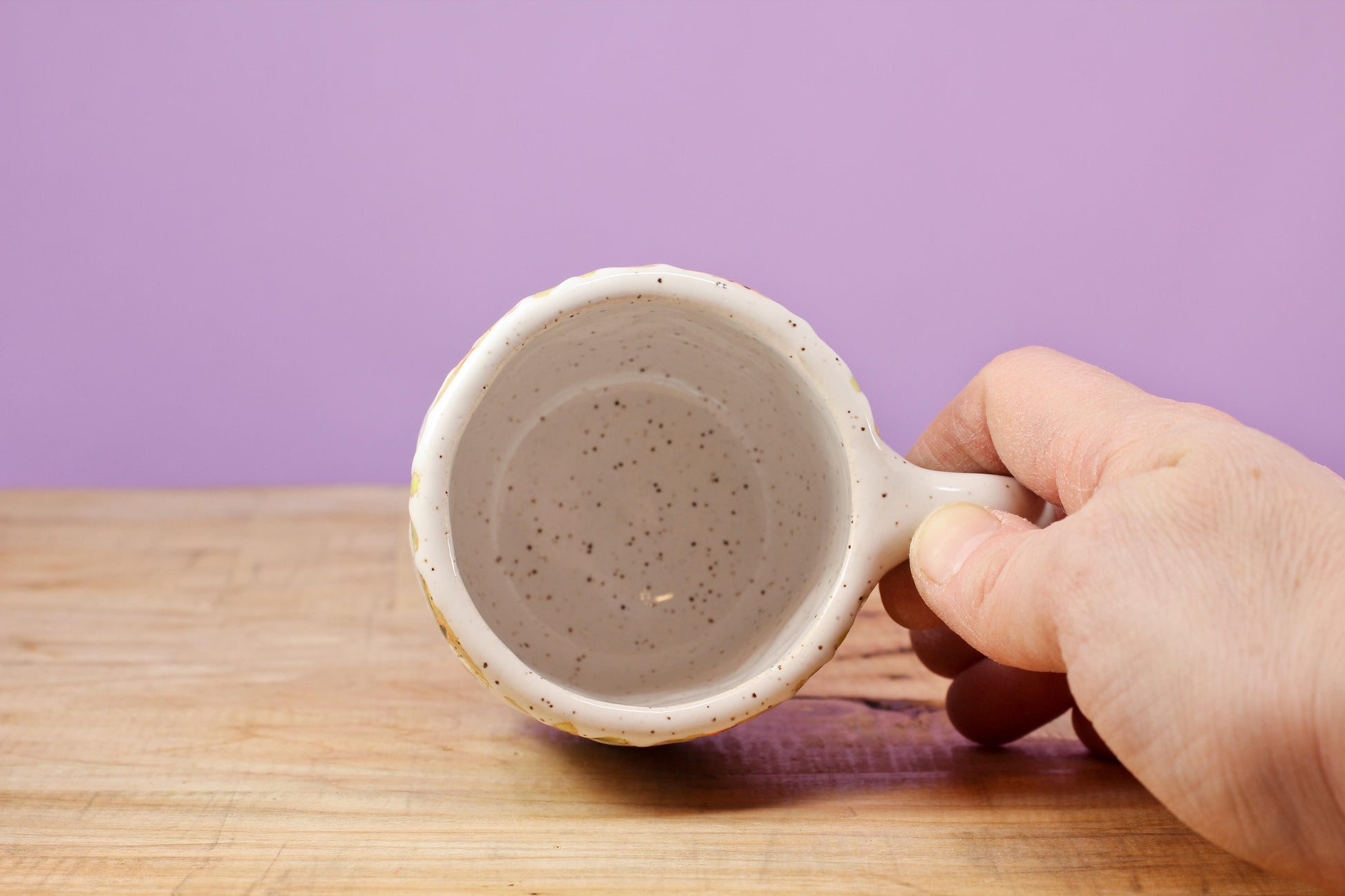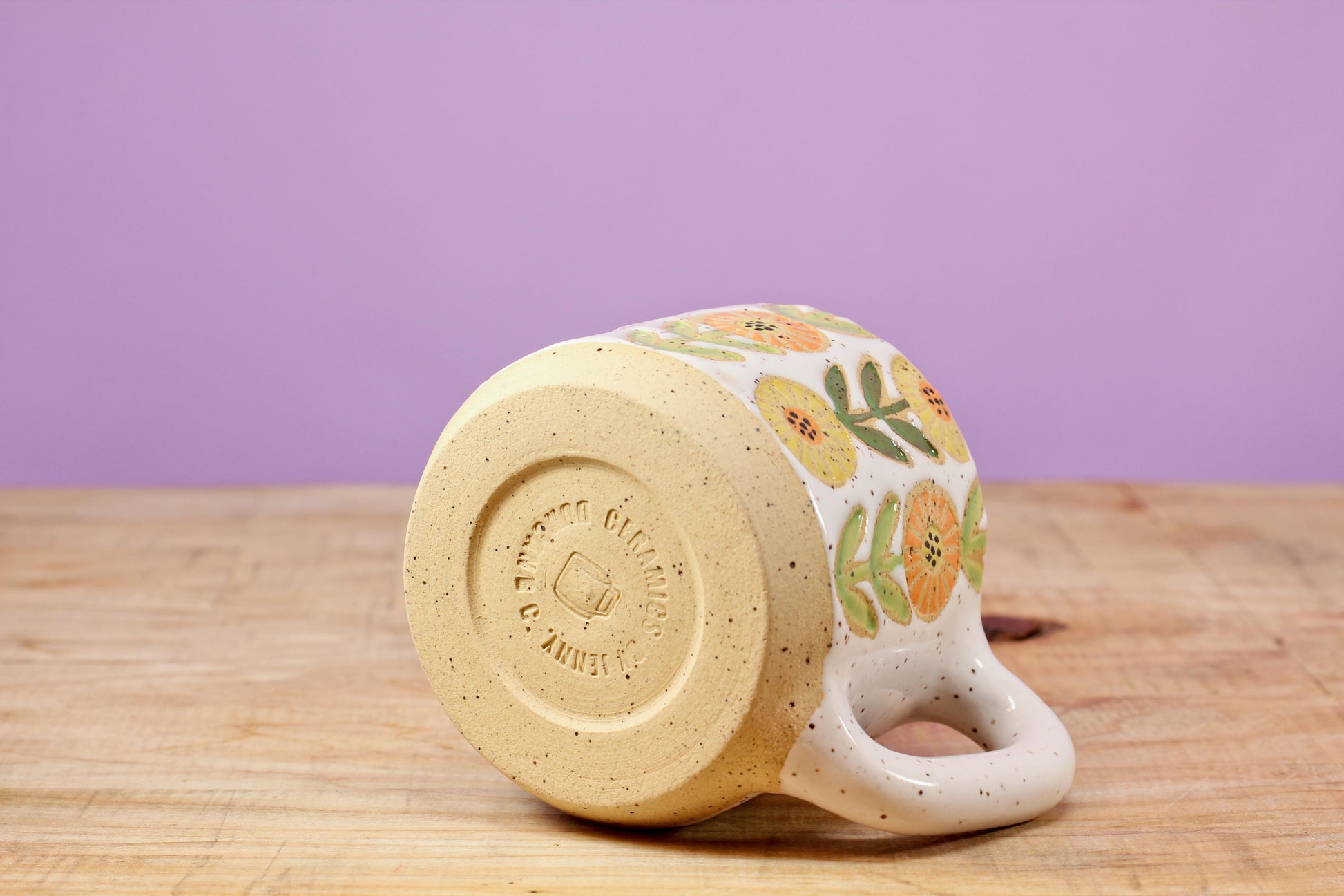 This handmade speckled stoneware Mini mug features a colourful stamped flower chain design that wraps around the entire surface. Perfect for the flower lover looking to add a touch of hand crafted goodness to their daily routine!