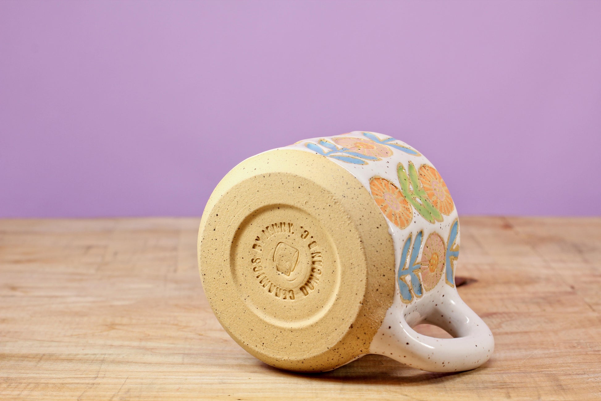This handmade speckled stoneware Mini mug features a colourful stamped flower chain design that wraps around the entire surface. Perfect for the flower lover looking to add a touch of hand crafted goodness to their daily routine!