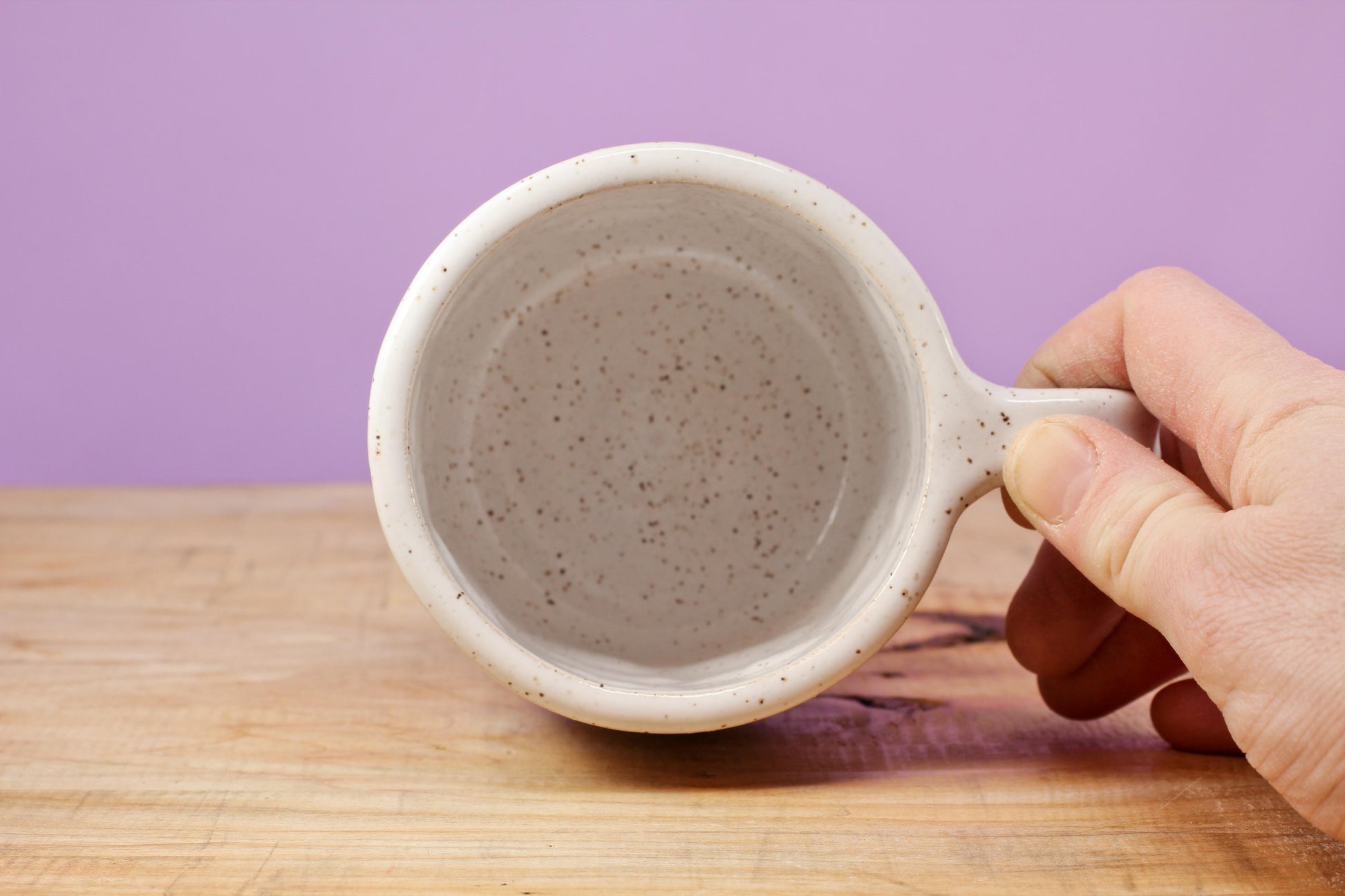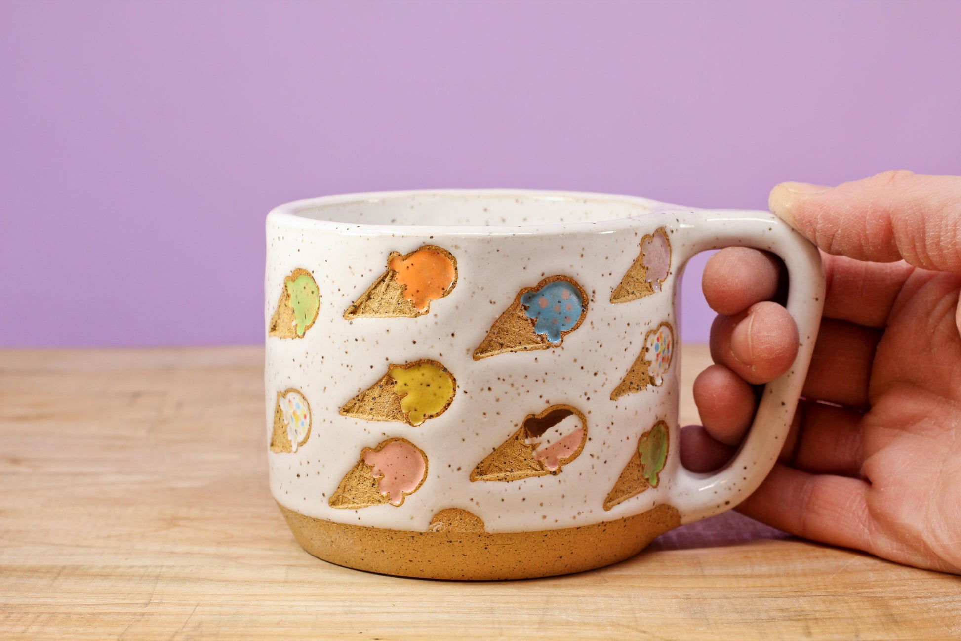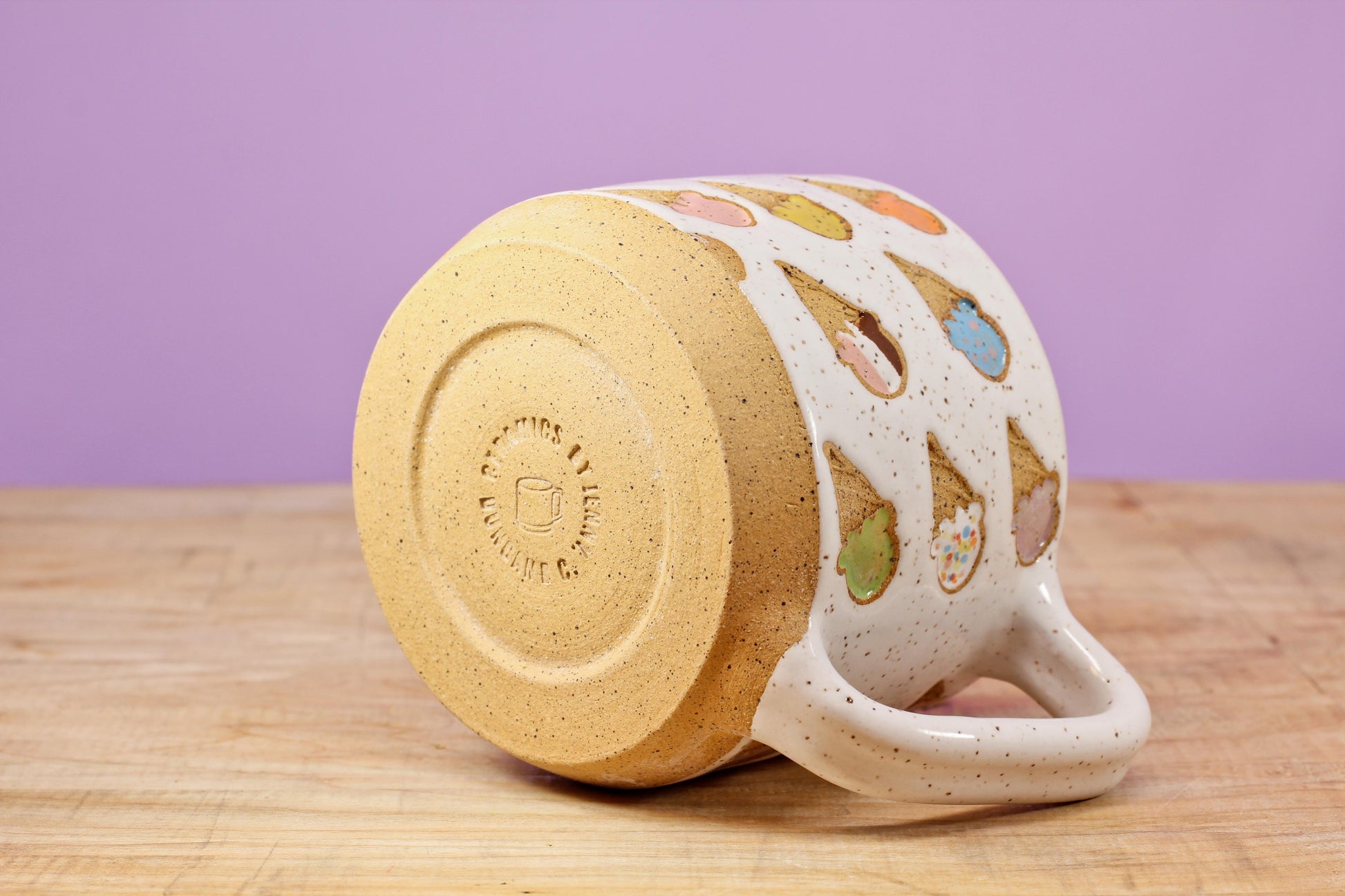 This super sweet ice cream mug is wheel thrown, hand stamped and glazed with yummy ice cream like colours! It is made with a speckled tan stoneware clay and dipped in a glossy white glaze. I am a fan of ice cream, and a fan of this mug!