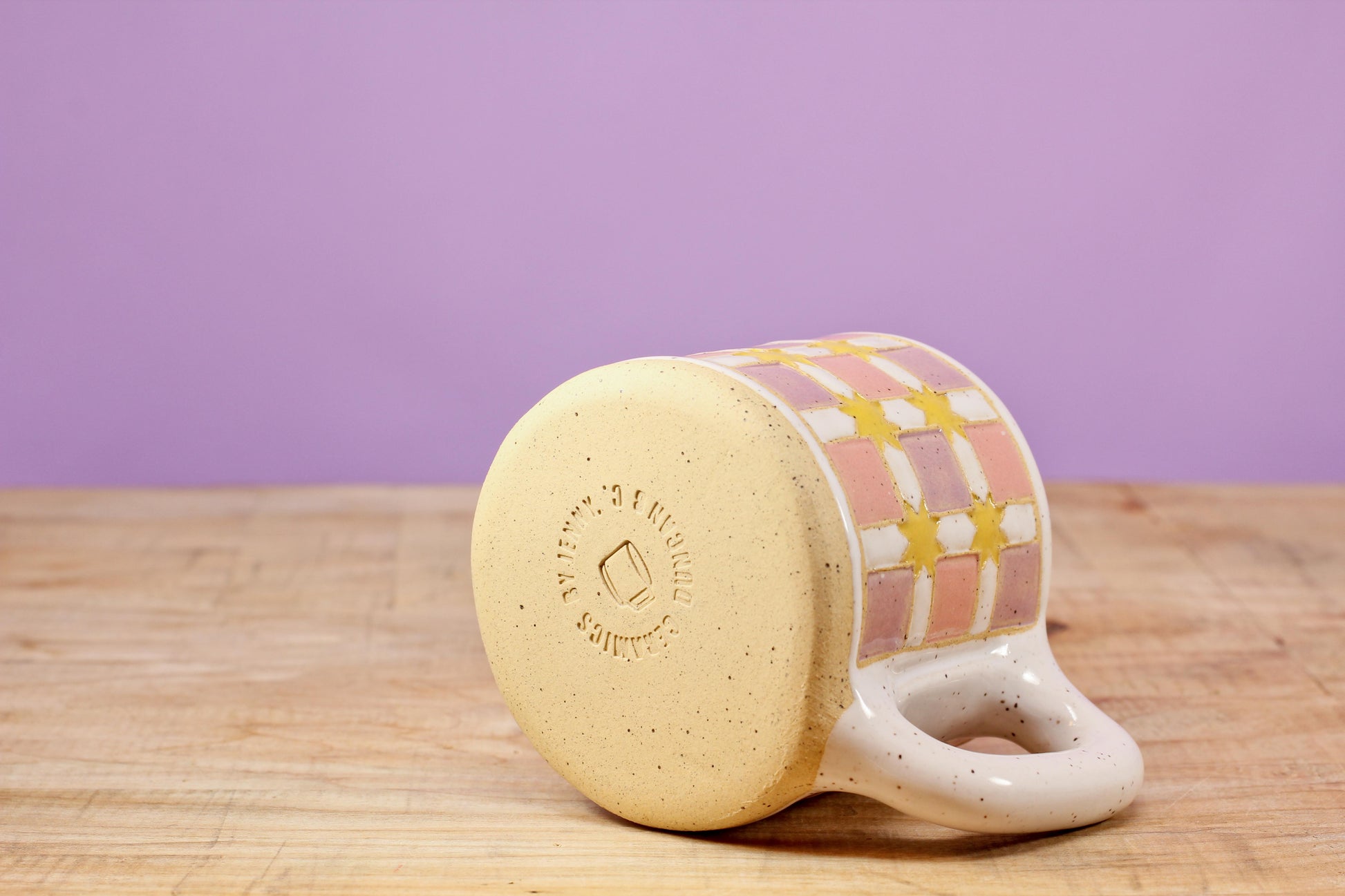 This hand built piece of magic was inspired by the sweet vintage quilts that my dreams are made of! Hand stamped, painted and slab built, this light speckled stoneware MINI mug has a slightly more organic shape than the wheel thrown pieces. Interior and handle are a glossy white with a mix of colourful glazes for the block and star details.