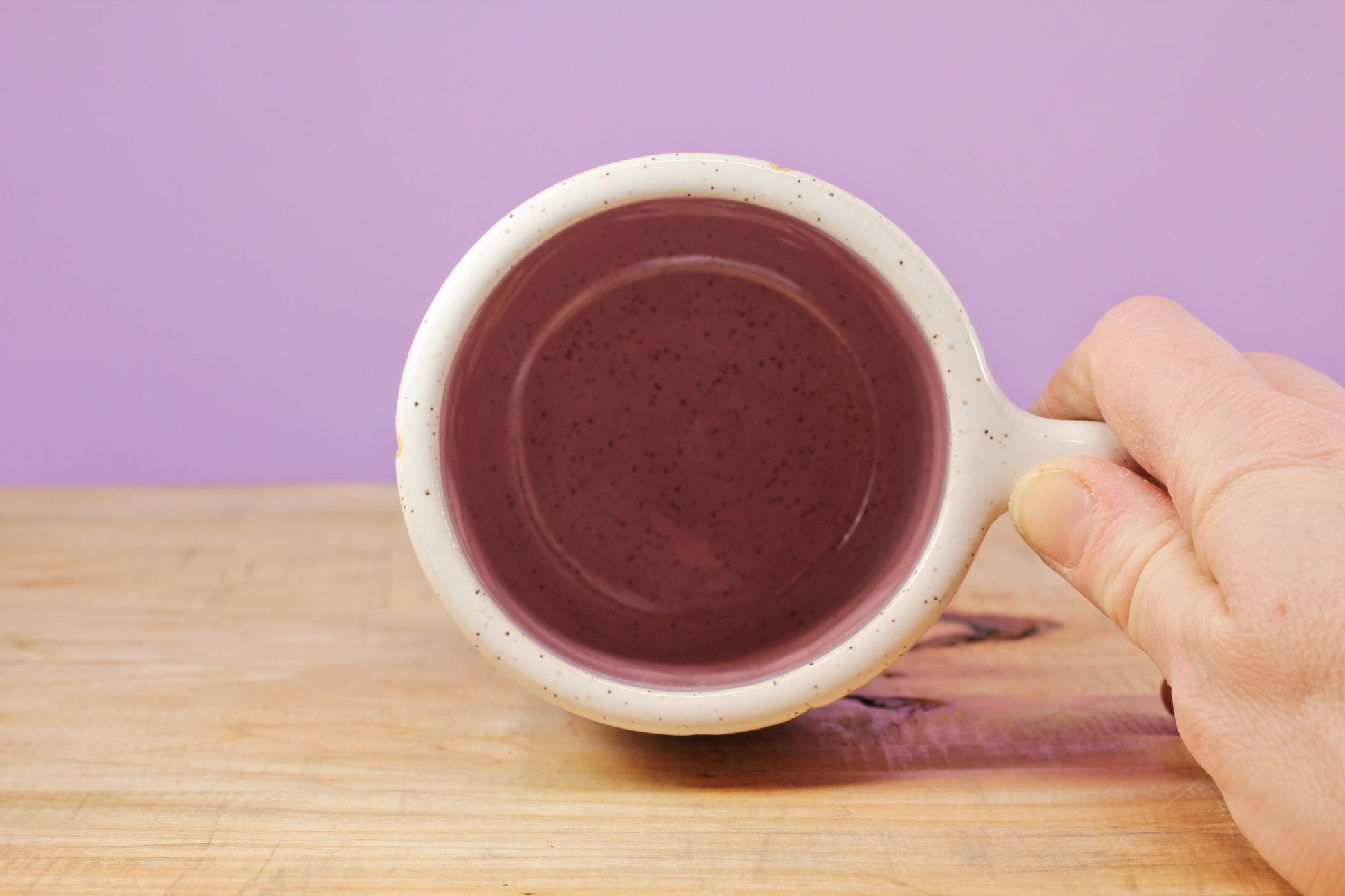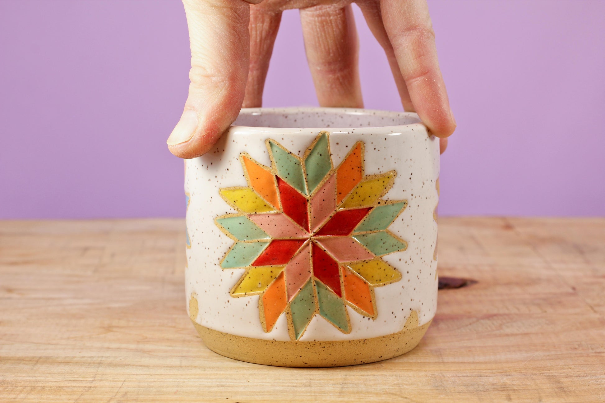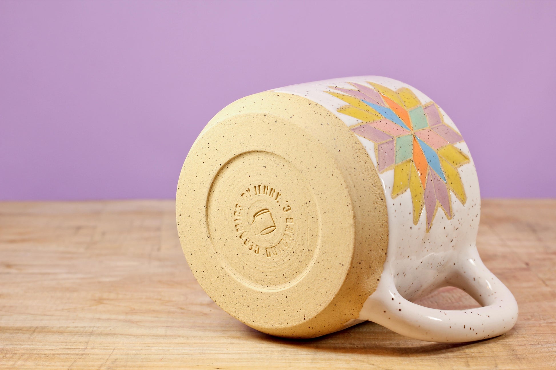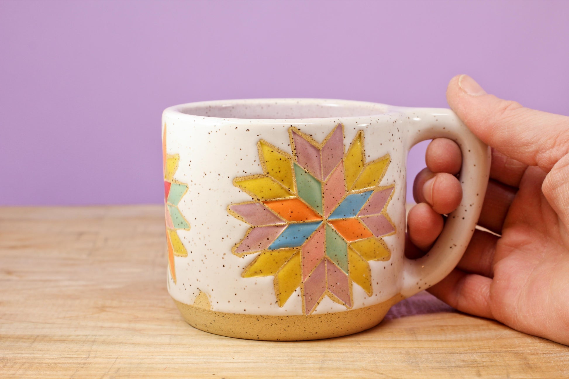 This darling of a mug is inspired by the beautiful vintage quiltwork of the 1930’s. It is wheel thrown with a light speckled stoneware clay and has a purple interior/white exterior. The surface designs are imprinted and hand painted with colourful glossy glazes. If your looking to add a little more vintage quilt goodness to your day without buying more quilts, this could be the mug for you!