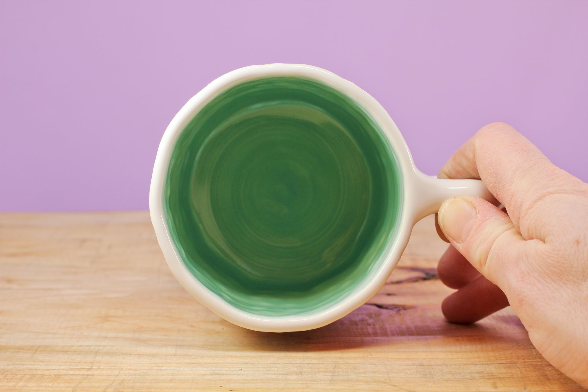 Cute, colourful and textured! The Stemmed Flower Mug is wheel thrown with a mid fire white stoneware. The surface design is imprinted and hand painted with brightly coloured flowers, a glossy white exterior and turquoise interior.