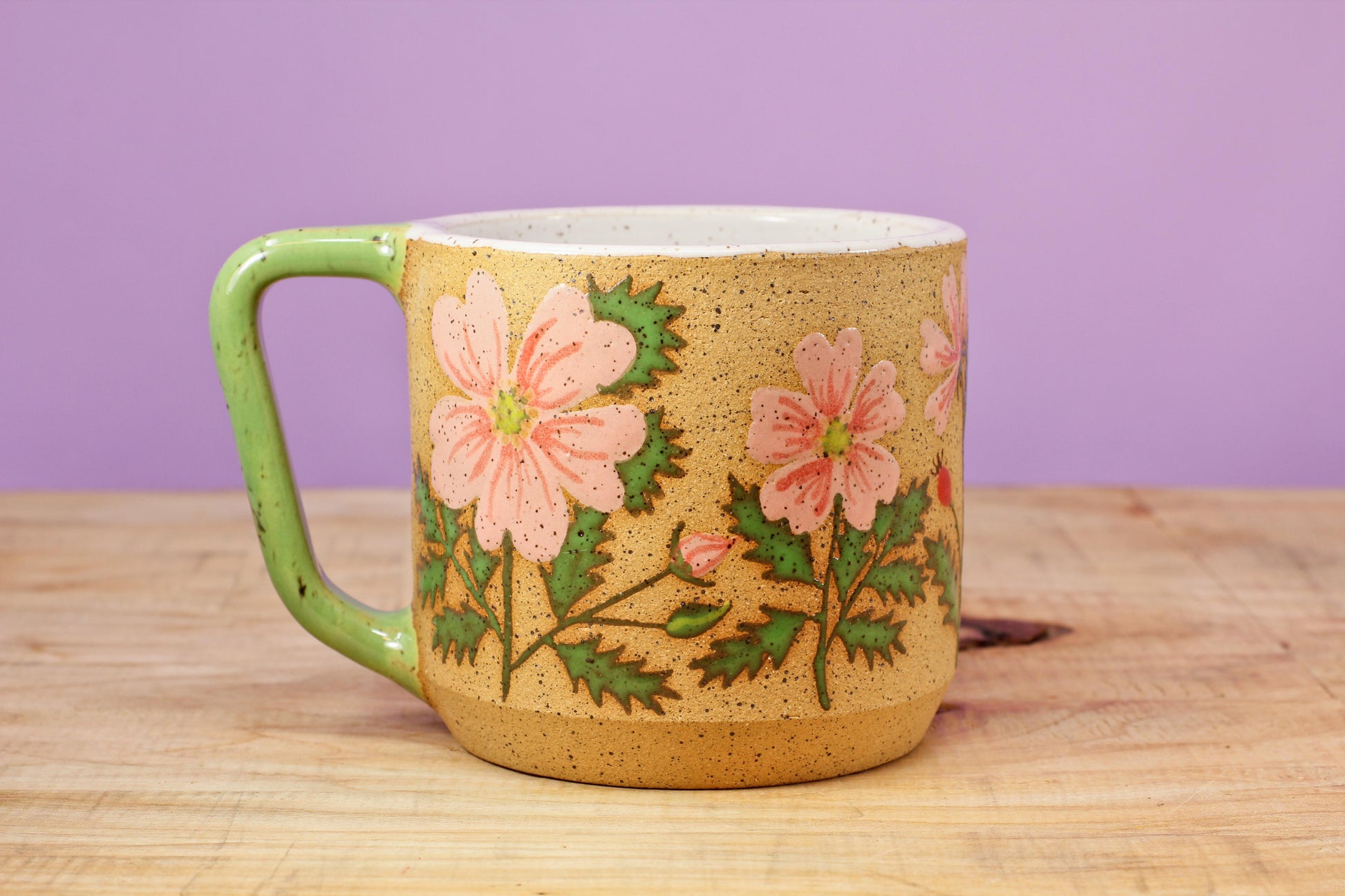 This darling wild rose mug is wheel thrown with stoneware and hand painted. It has a glossy white speckled interior and raw speckled tan exterior. The sweet little roses, buds and hips wrap all the way around and it is finished off with a light green handle.